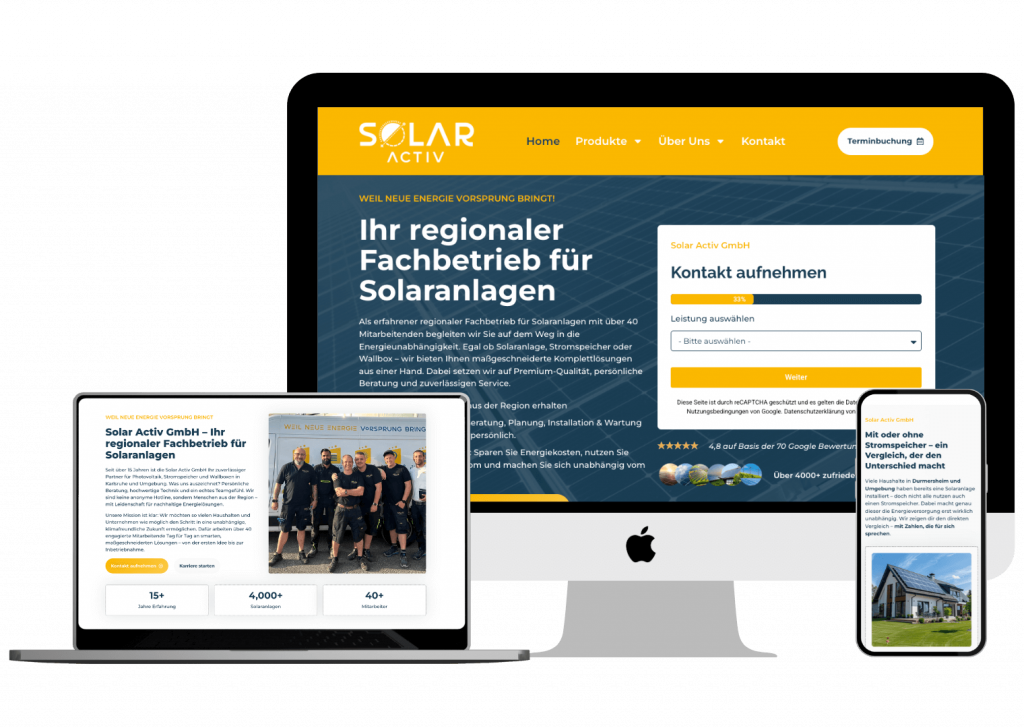 Für die Solar Activ GmbH haben wir die komplette Website überarbeitet – mit Fokus auf lokale Sichtbarkeit zum Thema Solaranlage kaufen. Bereits nach zwei Monaten der Zusammenarbeit rankt der Kunde bei Google auf Seite 1 zum Keyword Solaranlage kaufen Karlsruhe – zuvor war er hier nicht auffindbar. Durch regionale Landingpages und gezielte Fachartikel bauen wir die Sichtbarkeit nun kontinuierlich in über 20 Regionen weiter aus.